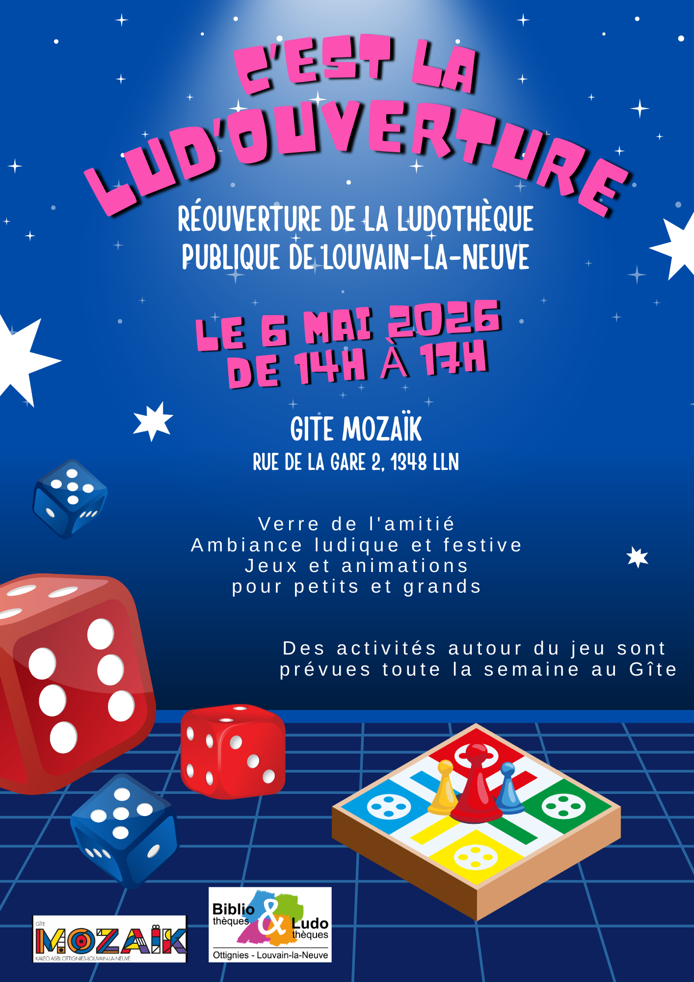Venez fêter avec nous la réouverture de la Ludothèque publique de Louvain-la-Neuve au Gîte Mozaïk (Rue de la Gare 2 - 1348 LLN) dans une ambiance ludique et festive !